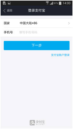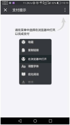 第三步:提示在浏览器中打开,点击微信提示上按钮,用手机浏览器打开,浏览器会自动打开某宝模块,用户进行某宝登录,并输入某宝的支付密码,完成整个支付交易。