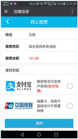 第二步:选择缴费档次、点击缴费后,需要选择缴费方式,不同的缴费方式手续费不一样,由于某宝免费使用,我们建议选择某宝支付。