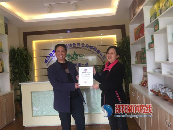 图为城步苗族自治县人民政府副县长熊雪娥给公司法人代表杨盛谈授牌