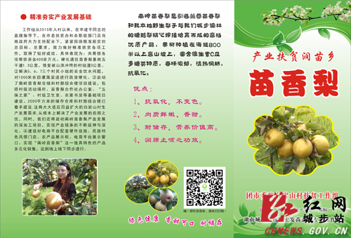 “我们将不忘初心,不辱使命,上下努力,干群齐心,让白岩山村百姓早日脱贫致富,成为小康生活的示范村。”扶贫工作组的同志一直践行着自己的承诺。她(他)们在挨家挨户调研、摸清底子的基础上,广泛征求村民意见,依据村里山地多、耕地少的具体情况,提出了种植业“一村一品”,选择了种植“苗香梨”高山水果作为主打产业,深度挖掘苗香梨产品的高山、绿色、健康、生态的纯天然产品优势。同时引入现代经营理念,帮助白岩山村向国家工商总局申请注册了“南岭苗香梨”产品商标,提升产品的品牌效应,增加产品附加值。