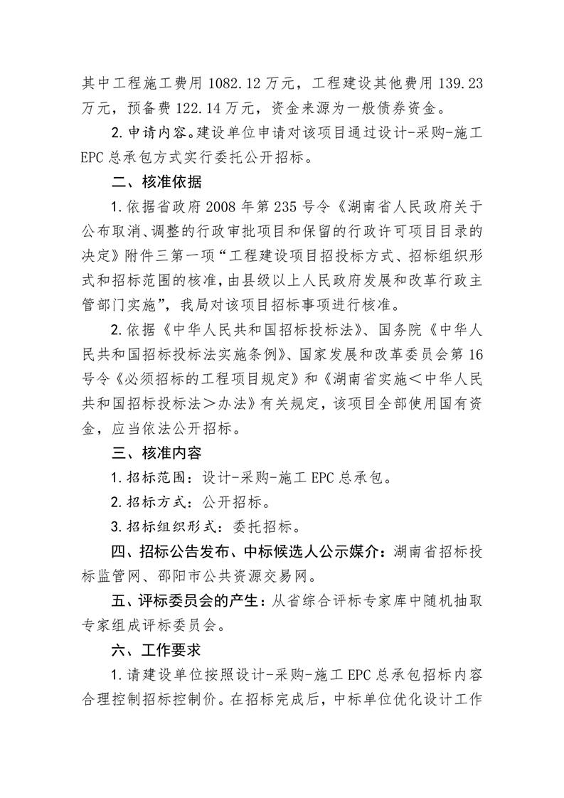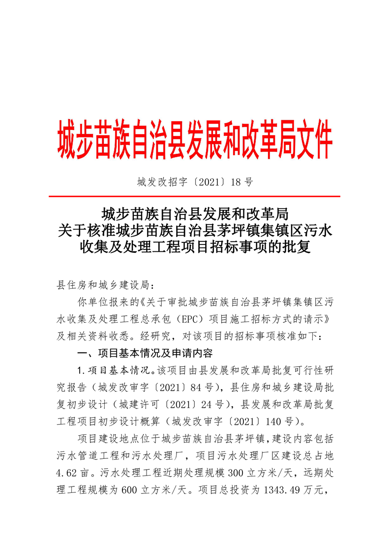 关于核准城步苗族自治县茅坪镇集镇区污水收集及处理工程项目招标事项的批复