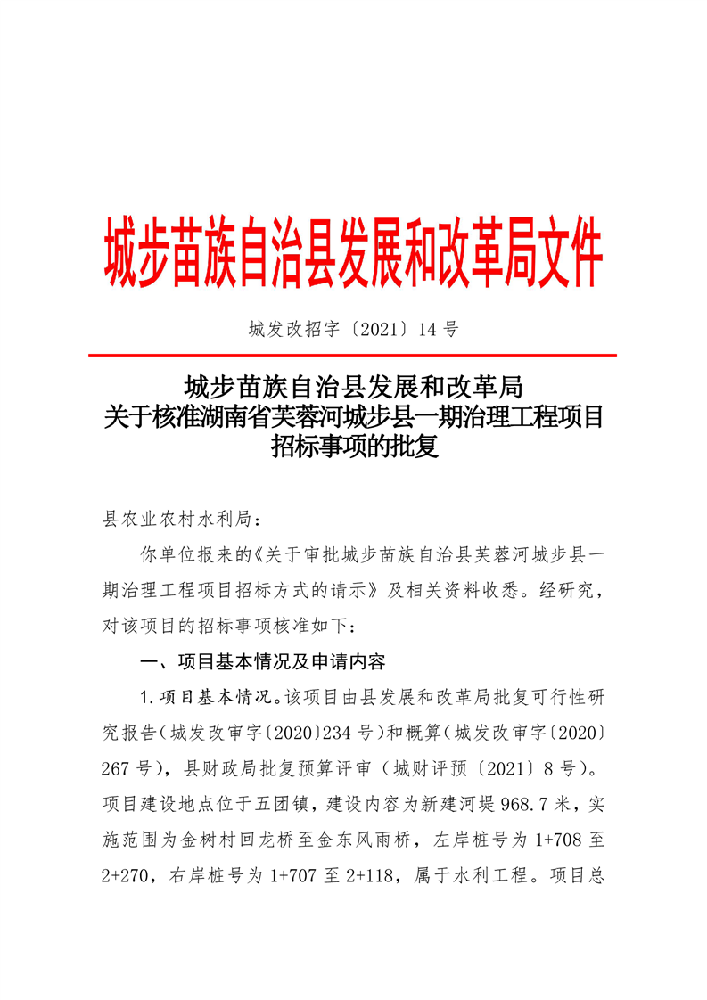 关于核准湖南省芙蓉河城步县一期治理工程项目招标事项的批复