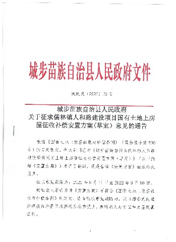 城步苗族自治县人民政府关于征求儒林镇人和路建设项目国有土地上房屋征收补偿安置方案(草案)意见的通告