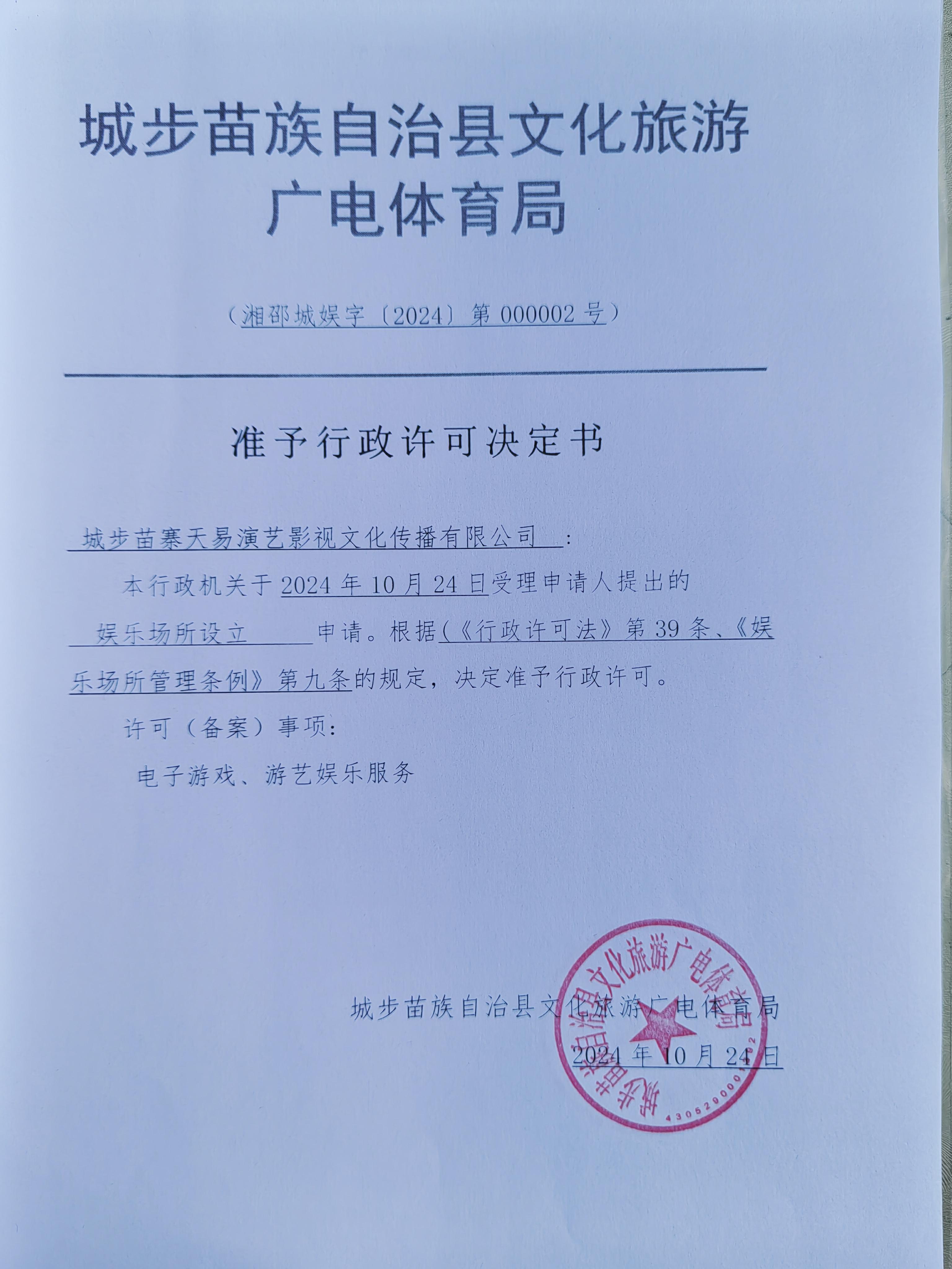 准予行政许可决定书(城步苗寨天易演艺影视文化传播有限公司)