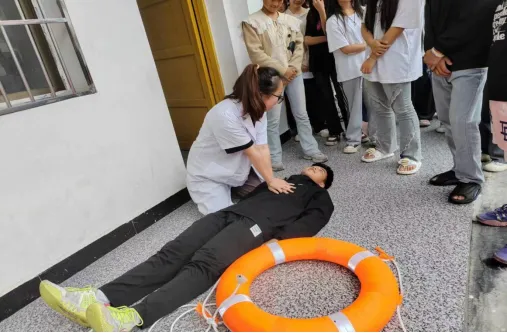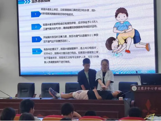 理论教育结束后,兰蓉乡卫生院工作人员邀请学生上台,现场教学演示如何针对溺水人员施救和急救,将之前所学的理论知识进行运用,激发了学生们的参与热情,有效巩固了学生们的防溺水安全知识。