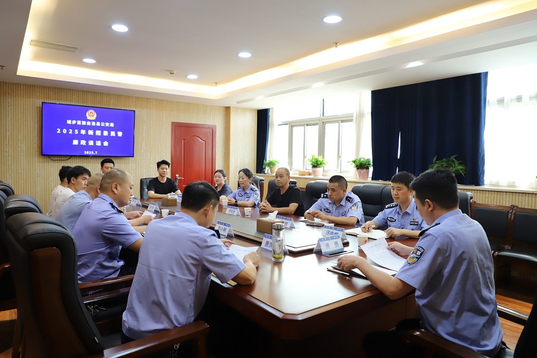 7月14日,城步苗族自治县公安局举行2025年新录用人民警察见面会及集体廉政谈话。副县长、县公安局局长肖勇出席会议并讲话。局党委副书记、政委唐洪斌主持会议并宣读了《新警分配方案》。局机关纪委负责人向全体新警讲授了专题廉政教育“第一课”,并进行了集体廉政谈话。在家的局党委班子成员、相关所室队主要负责人、2025年新招录民警参加会议。