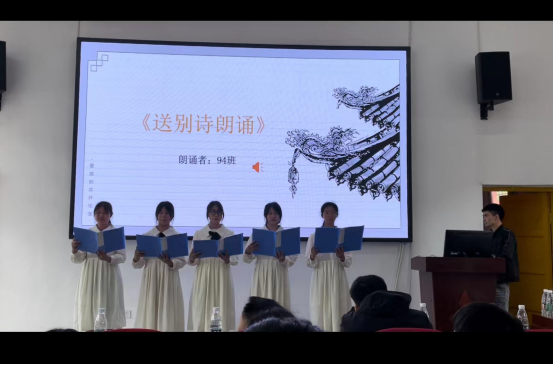 接着94班带来的《送别诗》朗诵,他们在临近毕业的时光,用自己的方式来表达对母校、对老师、对同学的依依不舍。希望他们在未来的征途多一些“海内存知己,天涯若比邻的”洒脱,多一些“长风破浪会有时,直挂云帆济沧海”的豪迈;多一份“黄沙百战穿金甲,不破楼兰终不还”的勇气,多一份“天下兴亡,匹夫有责”的胸怀…