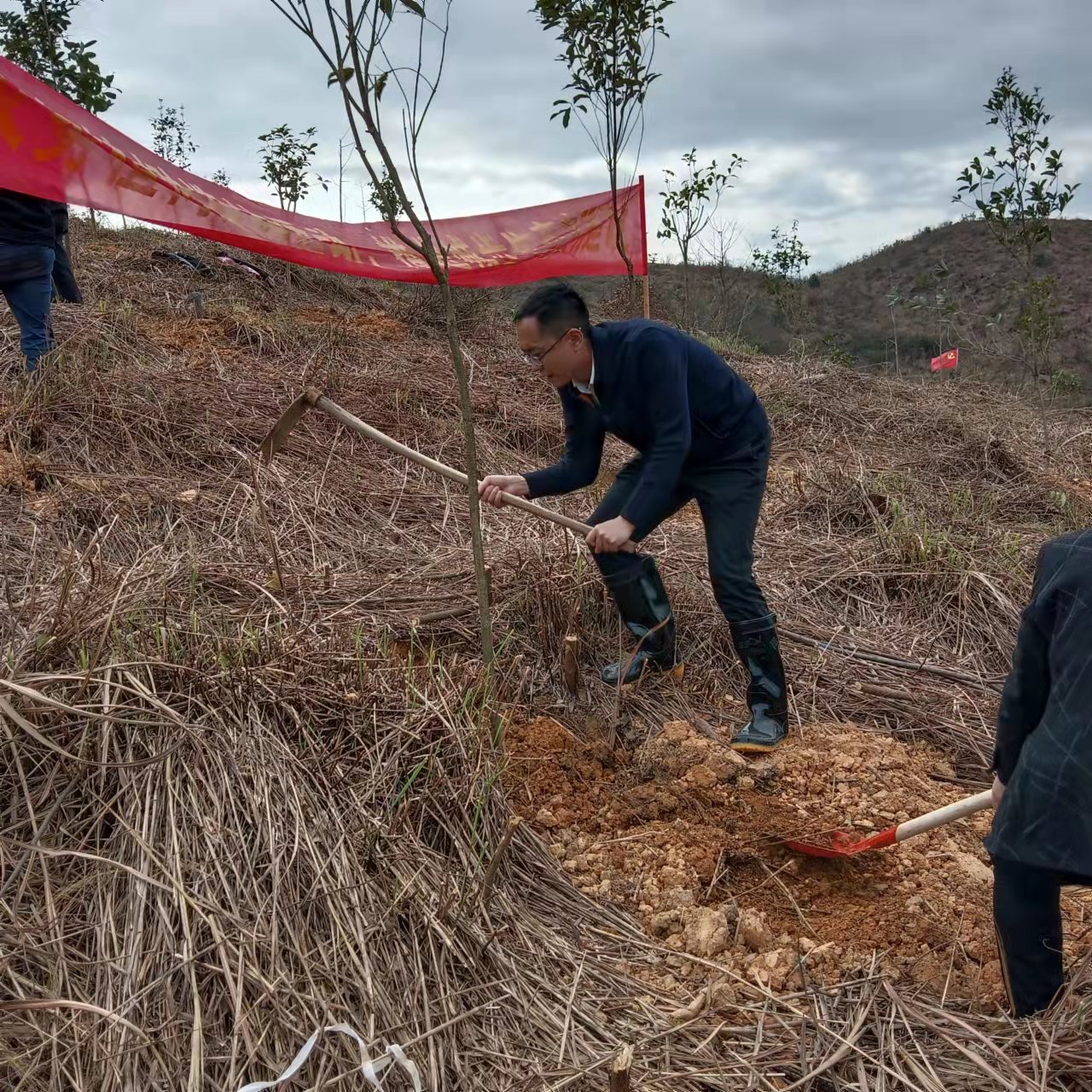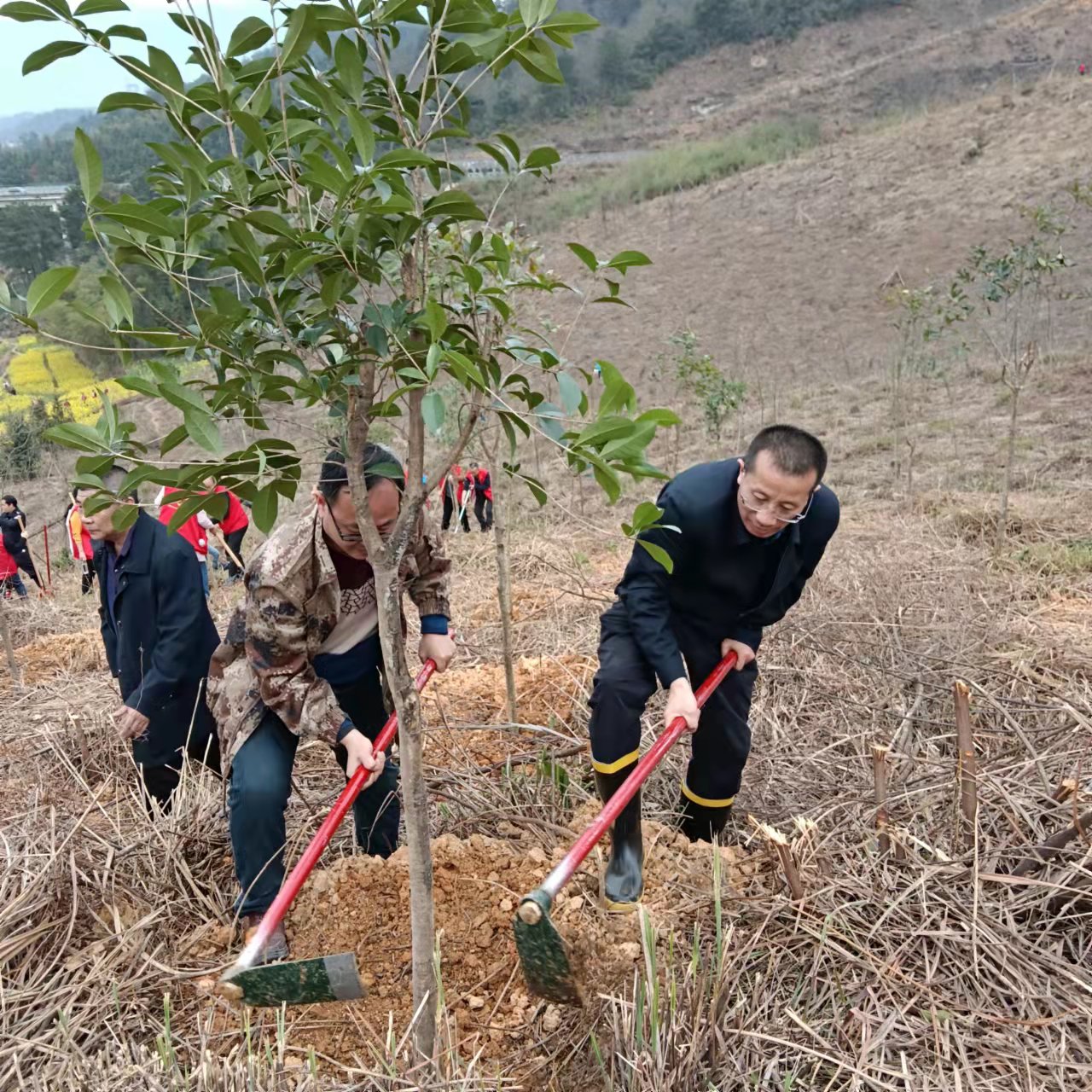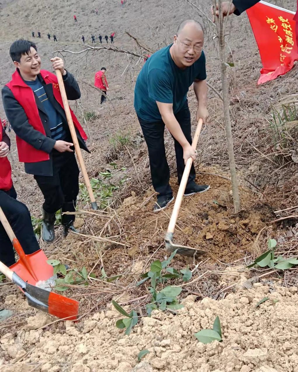 植树现场,各山头红旗飘扬,身着“志愿红”的干部群众分工协作,挥舞锄头、铁锹,配合默契,忙而有序,呈现出一派热火朝天的劳动景象。50余名林业技术员在各义务植树点分发放苗木,作现场技术指导,刨坑、扶苗、培土,各单位认真细致地完成每道植树环节,超额完成分配任务,荒凉的山头披上了绿装,桂花树、银杏树迎风站立、生机盎然,横竖对称,排排成行,成为高速公路边一道道靓丽的风景。