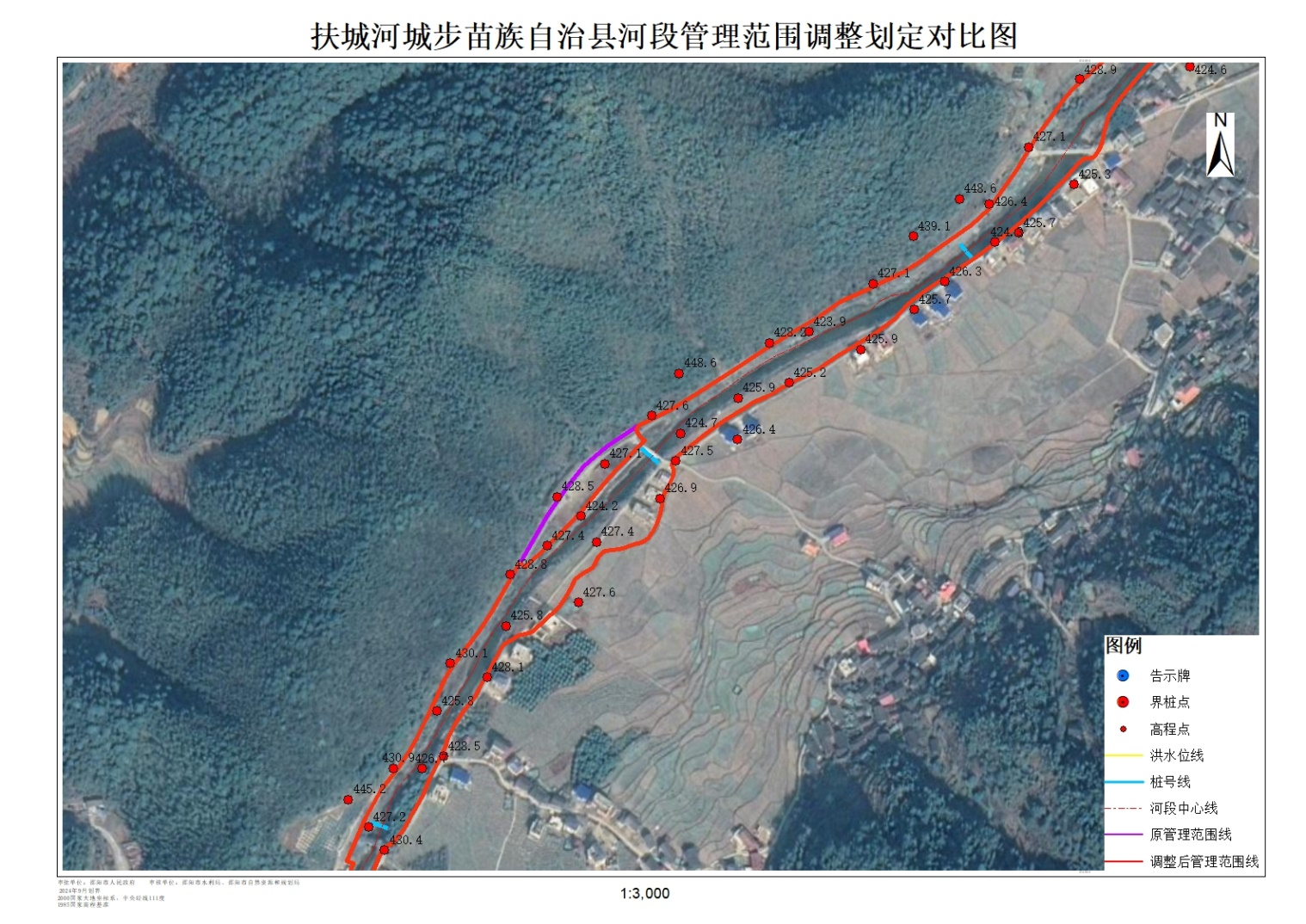 根据《湖南省水利厅湖南省自然资源厅关于印发<湖南省河湖管理范围划定成果调整办法>的通知》(湘水发〔2022〕46号)文件要求,进一步明确河湖管理空间,在依法划定河湖范围的基础上开展成果复核工作,因扶城河城步苗族自治县丹口镇枫木陵桥段左护岸工程已完工验收,经扶城河城步苗族自治县河段沿河属地政府丹口镇初核,2024年11月经市水利局、市自然资源局专家评审,拟对扶城河丹口镇枫木陵桥段K05+120~K05+291长0.171km河段左岸设计洪水位及管理范围进行调整。2025年4月18日经县人民政府同意《扶城河丹口镇枫木陵桥段管理范围划定成果调整方案》的批复(城政函[2025]11号)。 特此公告。 附:扶城河城步苗族自治县河段管理范围调整划定对比图 城步苗族自治县农业农村局 2025年5月14日
