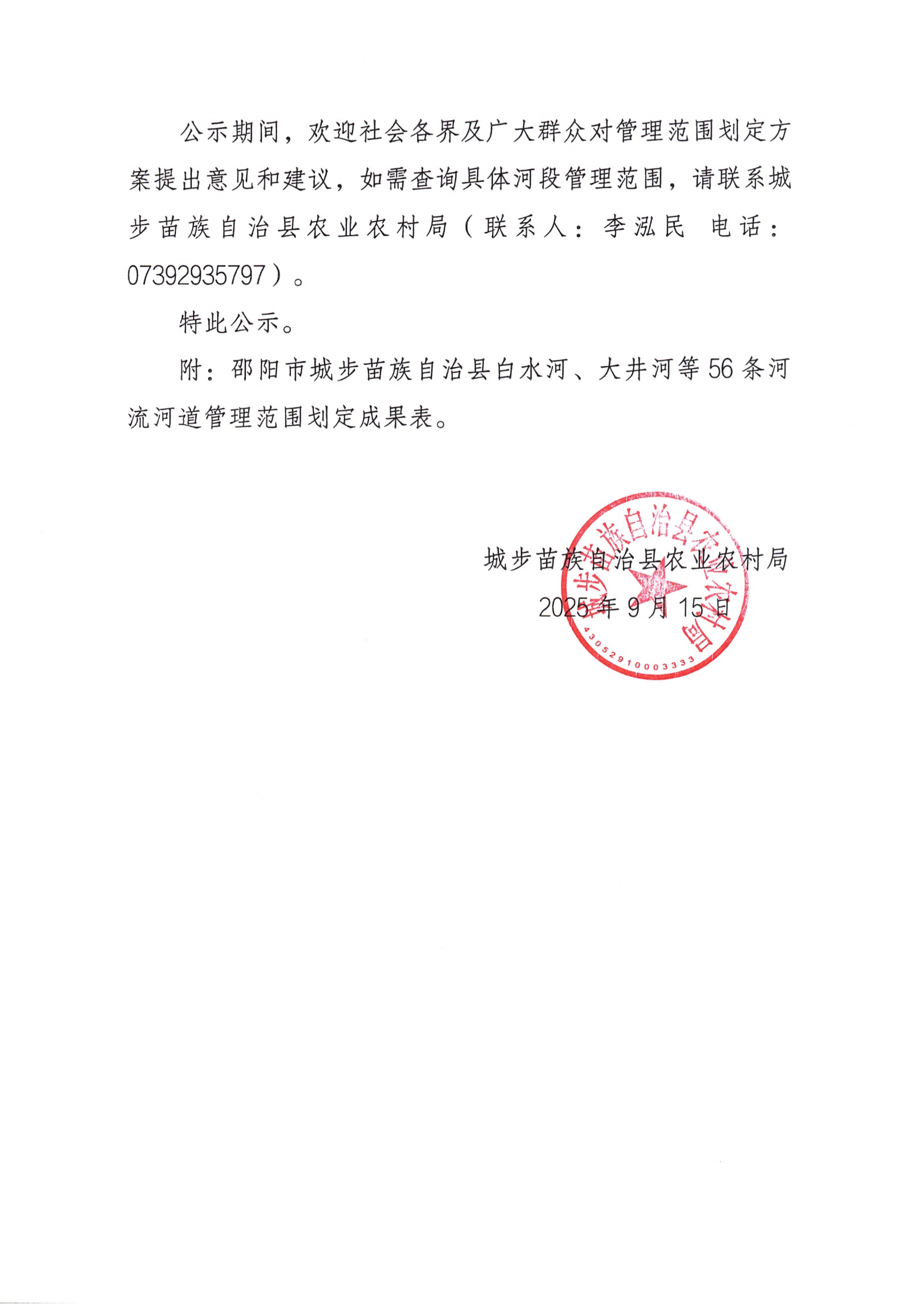 关于邵阳市城步苗族自治县白水河、大井河等56条河流河道管理范围划定成果的公示