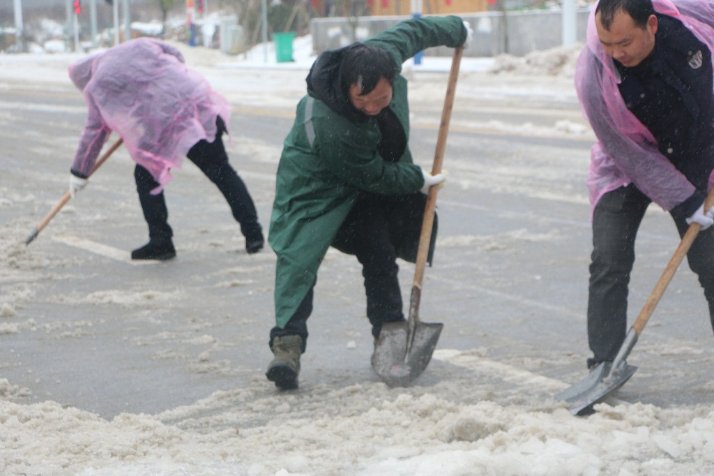 参与此次扫雪除冰行动的人数共计50余人,分成两组,分别负责不动产登记中心服务大厅门口和高互通路段的扫雪除冰工作。大家拿着铁锹、铁铲等工具,凿的凿、铲的铲,冷风刺骨、雨雪相伴,但国土卫士们却激情满满,干的热火朝天,不时还有周边老百姓熬好热姜茶送过来,为卫士们驱寒取暖。经过一个上午的努力,扫雪除冰工作基本完成,为附近居民及过往车辆出行提供了安全保障。