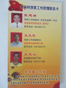 在检查过程中,一张小小民情联系卡引起检查组的极大兴趣——县发改局驻长兴村扶贫工作组为方便该村群众联系驻村队员,精心制作一张民情联系卡,每户一张。上面印有驻村工作队员的工作照和联系方式以及该村村支两委干部的联系电话。自从我局扶贫工作组进驻该村以来,有不少村民通过该联系卡与工作队员取得联系,反映村里情况、了解上级扶贫政策以及脱贫致富设想。我扶贫工作组将通过这张小小联系卡充分听取民意、吸取民智,制定适合当地发展的扶贫开发规划。