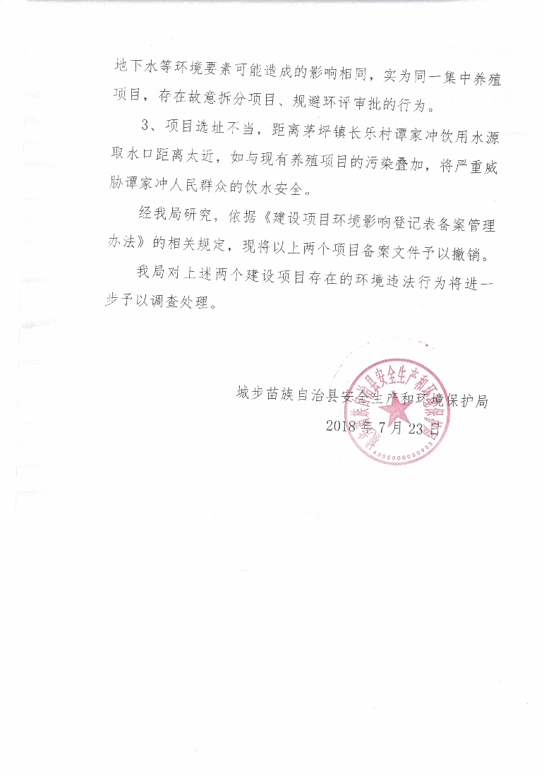 关于撤销城步天蓬农牧发展有限公司和城步大山岭牲畜养殖专业合作社建设项目环境影响登记表备案的决定