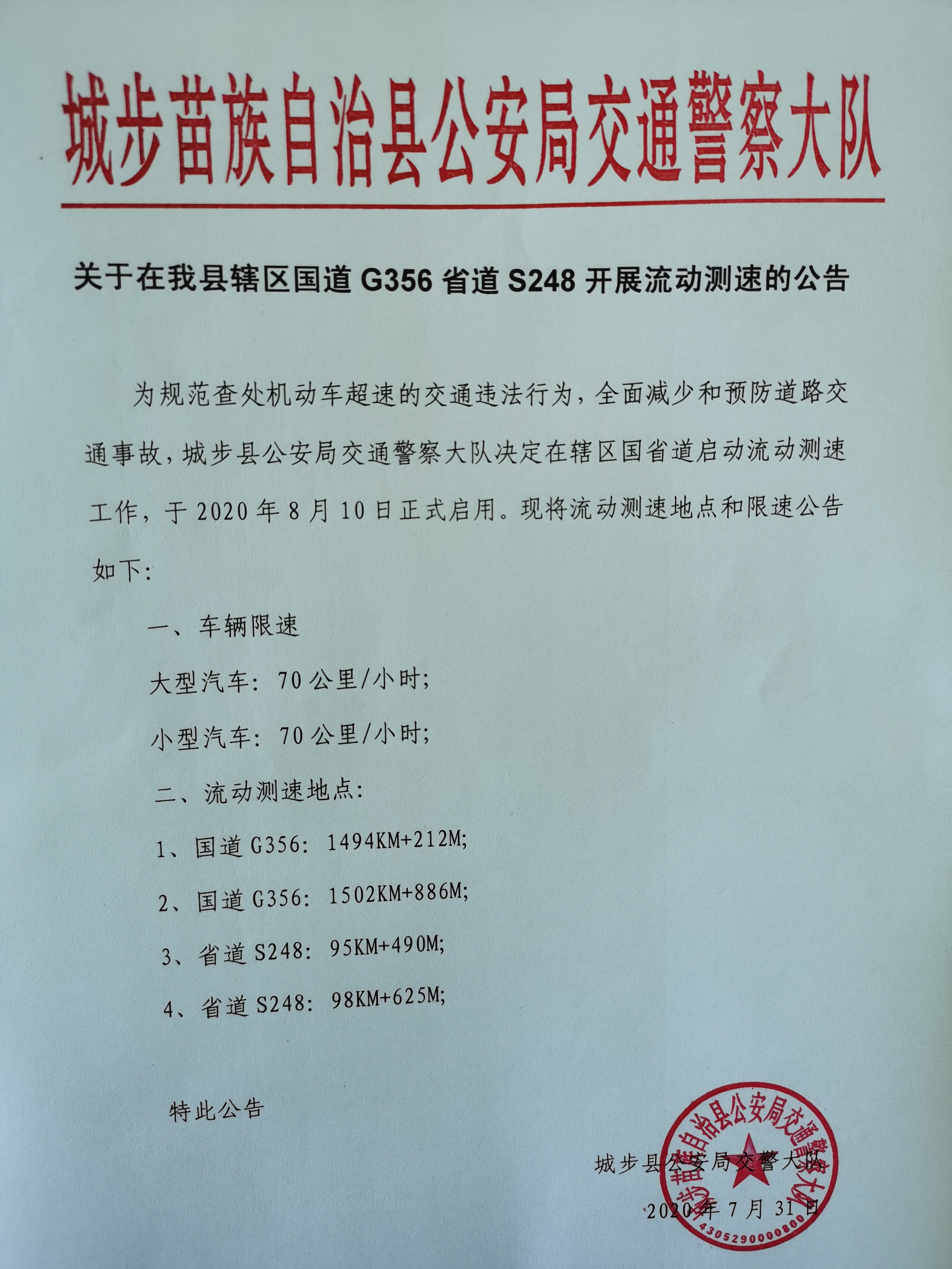 关于在我县辖区国道G356省道S248开展流动测速的公告