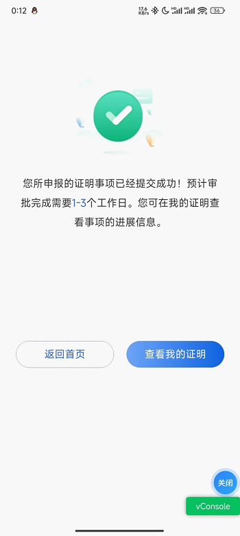 (5)可从成功页面点击“查看我的证明”,或从首页点击“我的证明”查看历史申请记录和办理进度