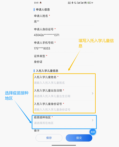 (3)按照提示,填写好入托入学儿童信息,并选择申报地区。