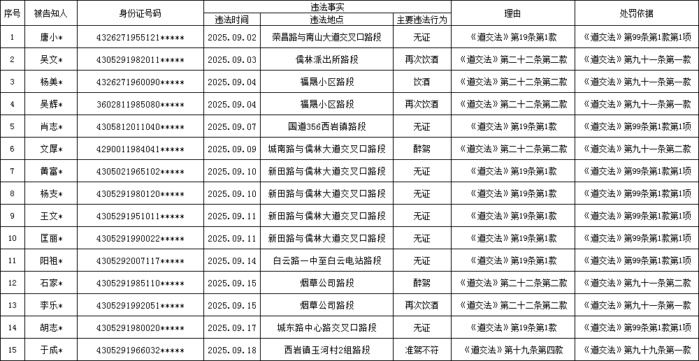 下列被告知人(见附表)在城步苗族自治县实施道路交通安全违法行为,被我大队依法查获并开具《公安交通管理行政强制措施凭证》或《道路交通安全违法行为处理通知书》。因被告知人无正当理由逾期未接受处理,我大队根据《湖南省实施<中华人民共和国道路交通安全法>办法》第四十六条第二款的规定,按照备案信息中的联系方式,通过邮寄《行政处罚告知书》等方式将拟作出的行政处罚决定的事实、理由、依据以及依法享有的权利予以告知,但被告知人未在告知后30日内接受处理,现采取公告方式告知拟作出行政处罚决定的事实、理由、依据、依法享有的权利,公告期为7日。公告期内,被告知人有提出陈述、申辩的权利,处吊销机动车驾驶证或单个违法行为较大数额(2000元以上)罚款的有要求听证的权利。需要陈述、申辩、听证的,应当自本公告发布之日起7日内向城步公安局交警大队依法提出,逾期未提出的,视为放弃陈述、申辩和听证权利,公安机关交通管理部门将根据调查的证据依法作出行政处罚决定。