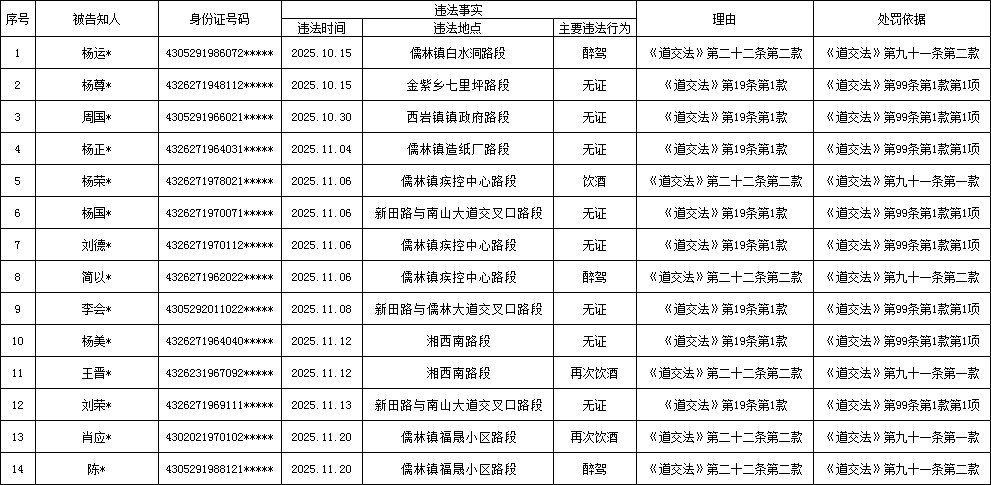 下列被告知人(见附表)在城步苗族自治县实施道路交通安全违法行为,被我大队依法查获并开具《公安交通管理行政强制措施凭证》或《道路交通安全违法行为处理通知书》。因被告知人无正当理由逾期未接受处理,我大队根据《湖南省实施<中华人民共和国道路交通安全法>办法》第四十六条第二款的规定,按照备案信息中的联系方式,通过邮寄《行政处罚告知书》等方式将拟作出的行政处罚决定的事实、理由、依据以及依法享有的权利予以告知,但被告知人未在告知后30日内接受处理,现采取公告方式告知拟作出行政处罚决定的事实、理由、依据、依法享有的权利,公告期为7日。公告期内,被告知人有提出陈述、申辩的权利,处吊销机动车驾驶证或单个违法行为较大数额(2000元以上)罚款的有要求听证的权利。需要陈述、申辩、听证的,应当自本公告发布之日起7日内向城步公安局交警大队依法提出,逾期未提出的,视为放弃陈述、申辩和听证权利,公安机关交通管理部门将根据调查的证据依法作出行政处罚决定。