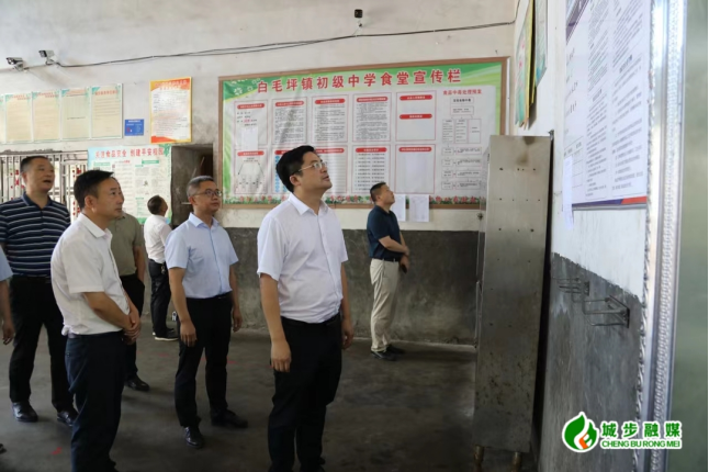 图为县委书记余勋伟一行在白毛坪中心学校了解学校食堂安全管理机制落实情况