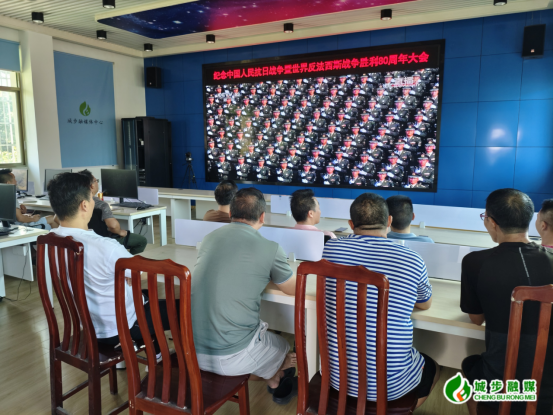 图为县融媒体中心干部职工收听收看纪念大会和阅兵仪式