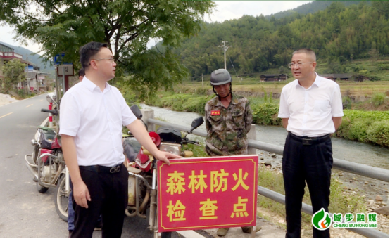 图为李宪(右一)在兰蓉乡森林防火检查点督导森林防火工作