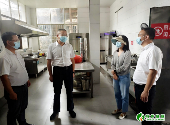 图为李宪(左二)在兰蓉乡中心学校食堂督导校园食品安全工作