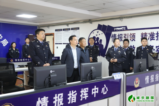 图为县委书记何德波在县公安局情报指挥中心查看指挥调度运行情况
