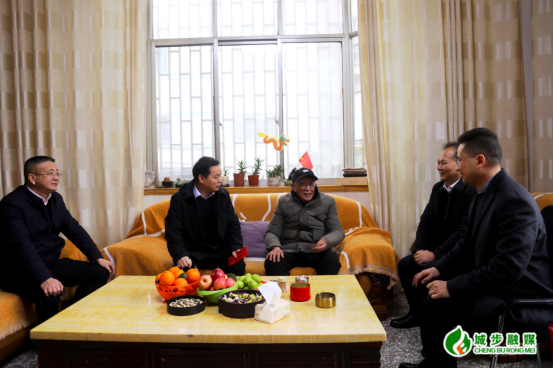 图为县委书记何德波一行走访慰问老干部赵枚成