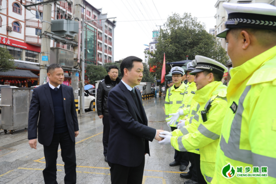 在城区重点路段执勤点,何德波一行与执勤的巡特警、交警一一握手交谈,详细了解春节期间勤务安排、交通流量及应急保障情况,对他们的辛勤付出表示衷心感谢。何德波指出,春节将至,人流、车流、物流持续攀升,社会面治安防控和道路交通压力显著增大,全体警务人员要始终绷紧安全之弦、站好平安之岗,把保安全、保畅通作为当前平安稳定的第一道防线,切实扛起“守一方平安、护万家团圆”的政治责任。同时,要科学统筹勤务安排,加强防寒保暖和后勤保障,确保队伍始终保持旺盛战斗力,以更饱满的状态守护好万家灯火。