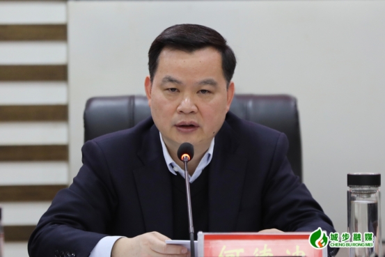 图为县委书记何德波在会上讲话