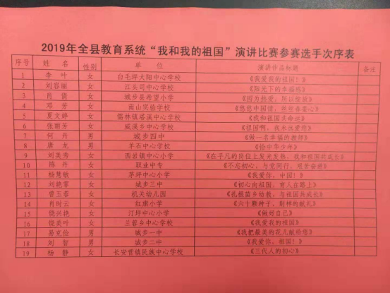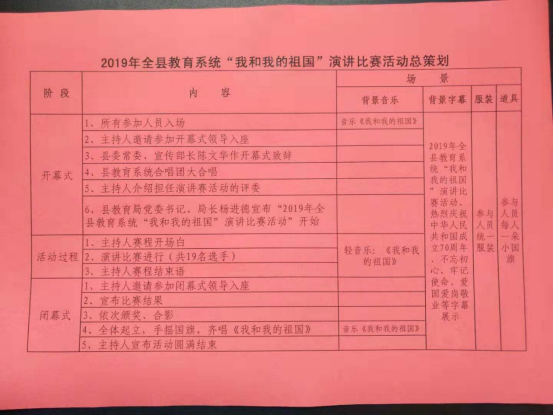 1、全县教育系统“我和我的祖国”演讲比赛县级赛时间安排表