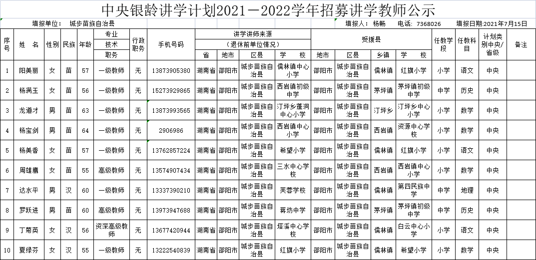 城步苗族自治县中央银龄讲学计划2021-2022学年招募讲学教师公示