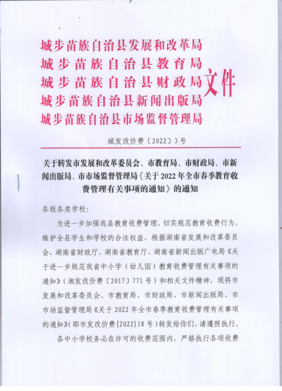 关于转发邵阳市发展和改革委员会、市教育局、市财政局、市新闻出版局、市市场监督管理局《关于2022年全市春季教育收费管理有关事项的通知》的通知