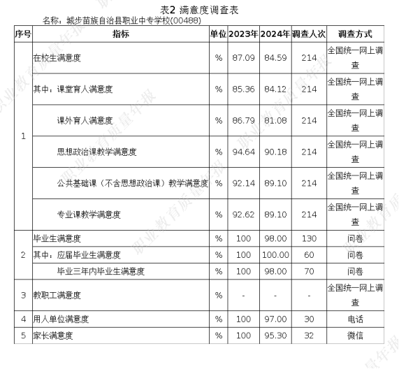 学校以“学生满意、家长满意、社会满意”为目标,秉承“博学、多思、立德、强技”的校训,以立德树人,促进就业为宗旨,通过政治课和班会课的教学,学生思想政治素质总体上是健康的、积极向上的,有理想,有目标,有较高的思想觉悟,有较高的政治参与意识,积极参加团组织活动。建立健全德育工作体系,完善各项管理制度,注重把社会主义核心价值观融入教育教学的全过程,坚持对学生日常行为规范进行规范考核,引导和教育学生树立正确的人生观、价值观,逐步培养学生养成良好的思想品德和行为习惯。一年来,中职学生操行评定合格率为 96.5%,学生违纪率在 1.2%以下,违法率为 0%。城步苗族自治县职业中专严格按照教育部颁布的教学大纲和专业标准的规定,开齐开足德育、语文、数学、外语、体育与健康、艺术、计算机基础等基础课程。语文、数学、外语、计算机基础等科目文化课测试合格率为 100%。专业技能测试合格率为 92%。学校坚持“三操两活动”,大力开展体育社团活动和体育竞赛活动,培养学生运动兴趣和习惯,确保学生每天体育锻炼 1 小时,提升学生身体素质。能够严格按照《国家学生体质健康标准》要求,开展学生体质健康测试和数据上报工作,2024 年学生体质健康测试达标率为 96.33%。