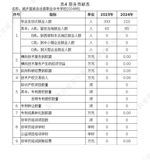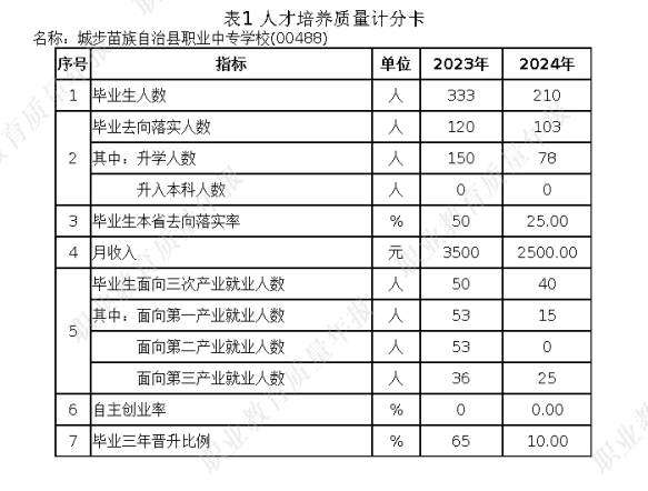2024年,城步苗族自治县职业中专共有毕业生220 人,比2023年无增加人数。参加对口升学并被高校录取 168 人,升入高等教育的比例为毕业生总数的 89.3%。升入高等教育的人数较上一年增加 60 人。在本届毕业生中,直接就业 28人,其中对口就业 50人。升入高等教育的也计算为直接就业和对口就业,则就业率达到了 99.3%。对口就业率为 91.5%。截止 2024年 9 月 30 日,毕业生初次就业率为 99.6%。初次就业起薪 2800-3500 元的毕业生占到了 10.3%。
