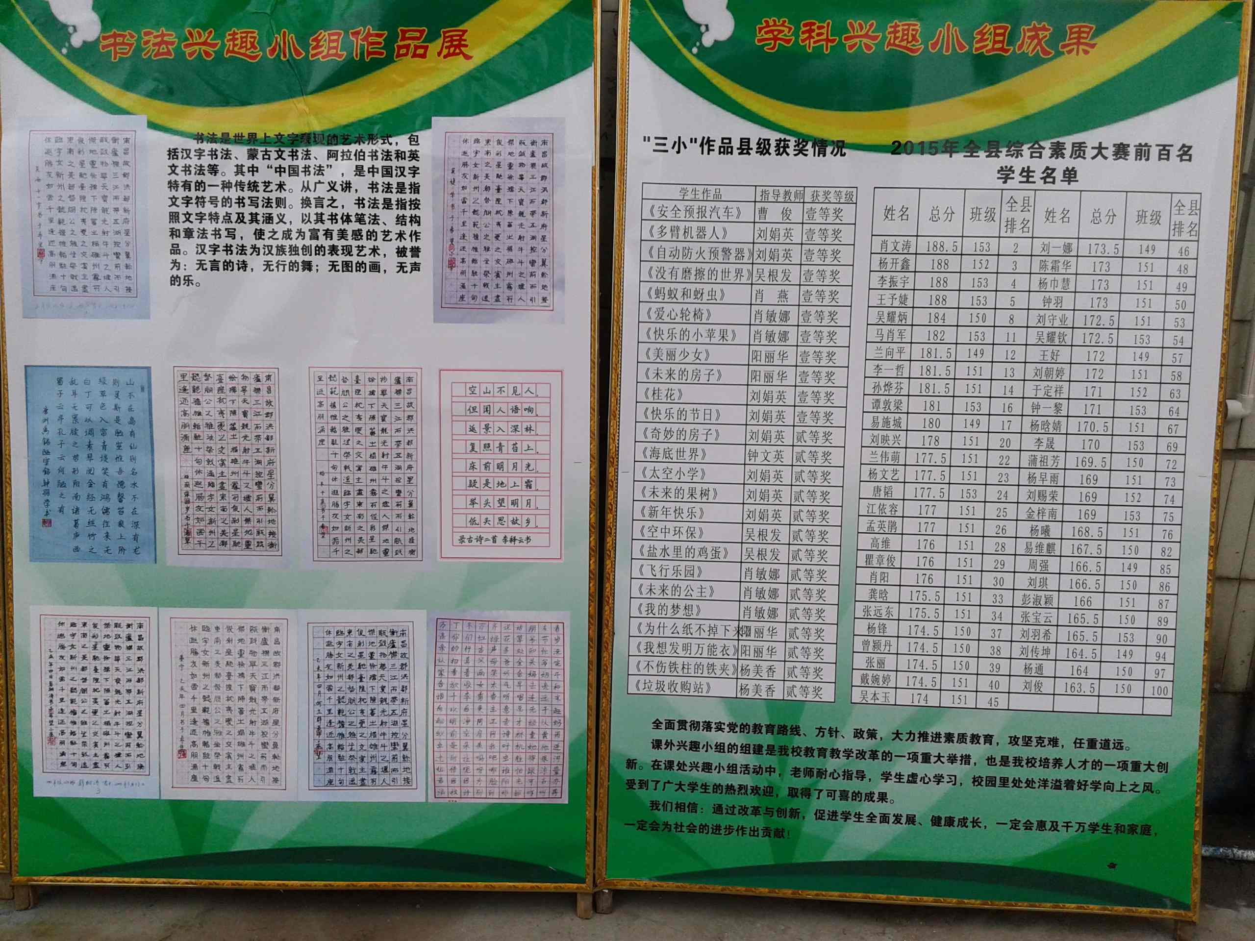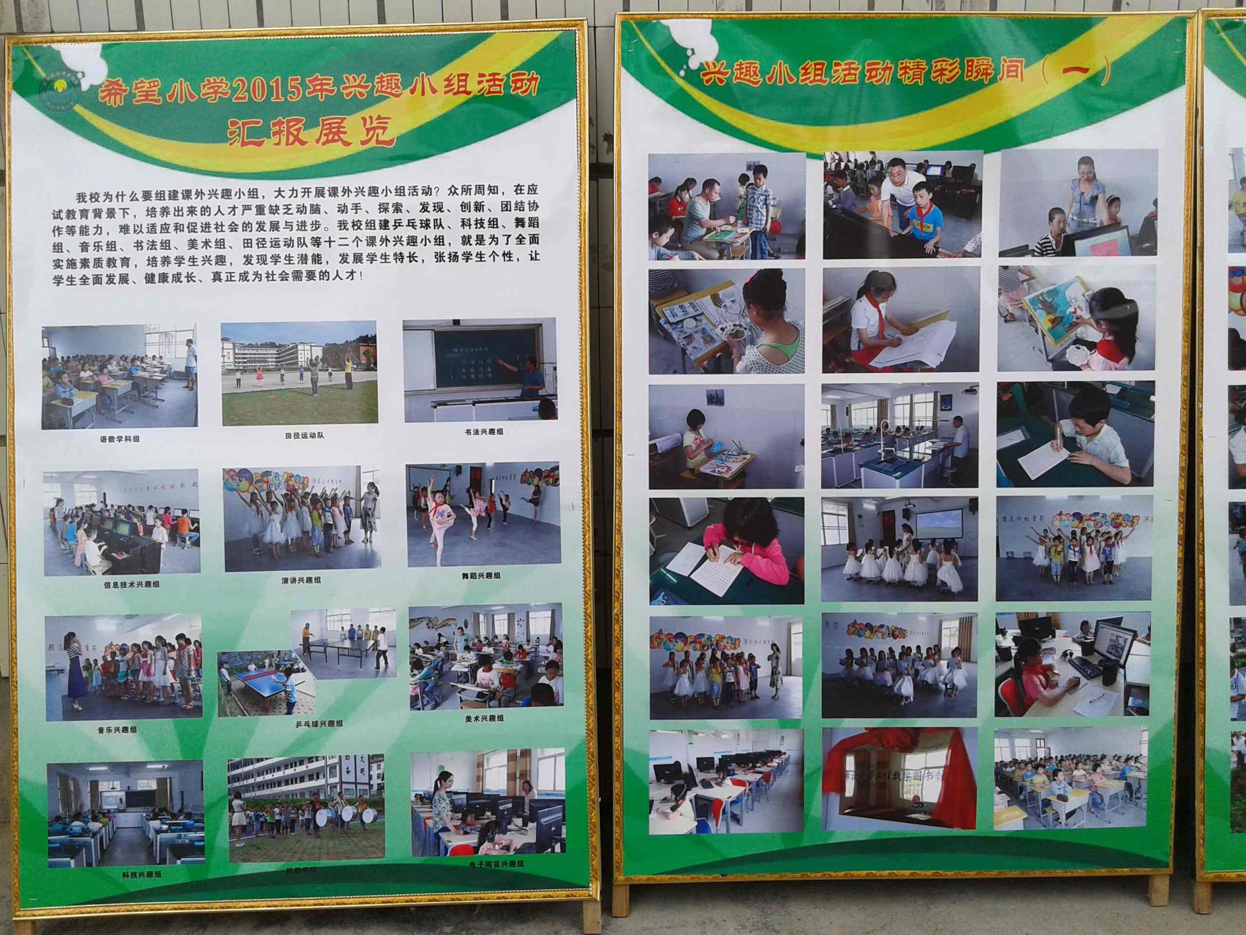 城步县希望小学为为进一步贯彻落实《全国基础教育课程改革纲要》,提升学校办学层次,培植学校特色,发展学生个性特长,促进学生全面发展,根据学校发展规划,近年来一直致力开展兴趣小组活动,通过开展丰富多彩、富有特色的课外小组活动,拓宽学生实践空间,让学生享有成功的喜悦。学校为促进学生个性的充分发展,共计开了语数、演讲、书法、美术、科技、音乐、乒乓球、鼓号队、电子阅览、、田径、信息技术、舞蹈十二个兴趣小组。希望小学兴趣小组实行“双选”制度:活动前的选师制—学生根据辅导老师的情况,选择自己感兴趣的老师;选课制—根据学校兴趣小组的开设情况,鼓励学生依据自身个性特长,特别是兴趣所向,选择自己认为有意义的兴趣小组。 为加强常规督促管理,避免兴趣小组的随意性和盲目性,学校要求辅导老师必须制订教学计划,学生定时到位(每周三下午3:20—4:30),学校定时查岗, 教师定时放学,如有特殊情况,必须及时与家长或班主任取得联系。