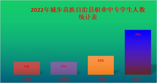 现有全日制在校生795人,学校年招生规模稳定在260人以上,在校生规模795人以上,毕业生规模230人以上,生源主要来自本县,学校开设电子技术应用、计算机应用、电子商务、服装制作与生产管理、会计事务等5个专业。学生巩固率在93%以上。各项指标与上一年度相比略有增长。