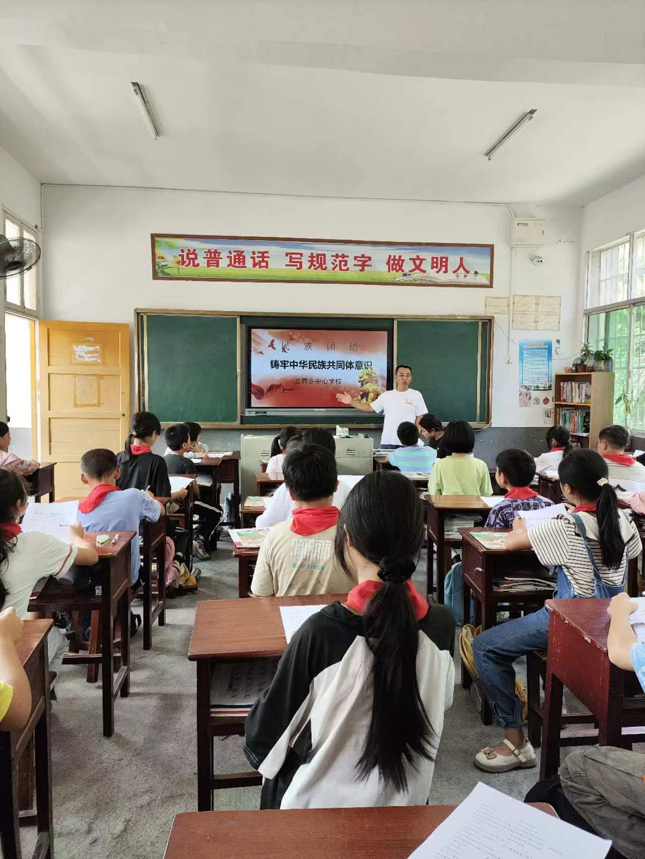 教师通过政教处提供的参考课件向学生讲解了铸牢中华民族共同体意识的核心内容是实现“一个目标”,即维护国家统一和民族团结,实现中华民族伟大复兴;达到“两个共同”,即各民族共同团结奋斗、共同繁荣发展;增强“三个意识”,即国家意识、公民意识、法治意识;增进“五个认同”,即对伟大祖国、中华民族、中华文化、中国共产党、中国特色社会主义认同;树牢“五观”,即祖国观、民族观、文化观、历史观、宗教观等方面内容。