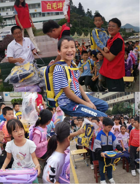 9月5日,中华儿童慈善救助基金会护童圆梦项目组、湖南聚荣红色教育文化传播有限公司、湖南晴岱文化、上海纯石资讯管理中心及电影《你笑得真好看》剧组在县委宣传部、县政府办、县政府发展研究中心、镇政府的陪同下,来到白毛坪镇中心小学进行“助学献爱心”捐献书包活动。国旗在空中飘扬,爱心在手中传递,他们的爱心举动给我们全体师生送来了温暖,这些书包将会极大地丰富孩子们的学习生活,也能让孩子们感受到来自社会的关怀。