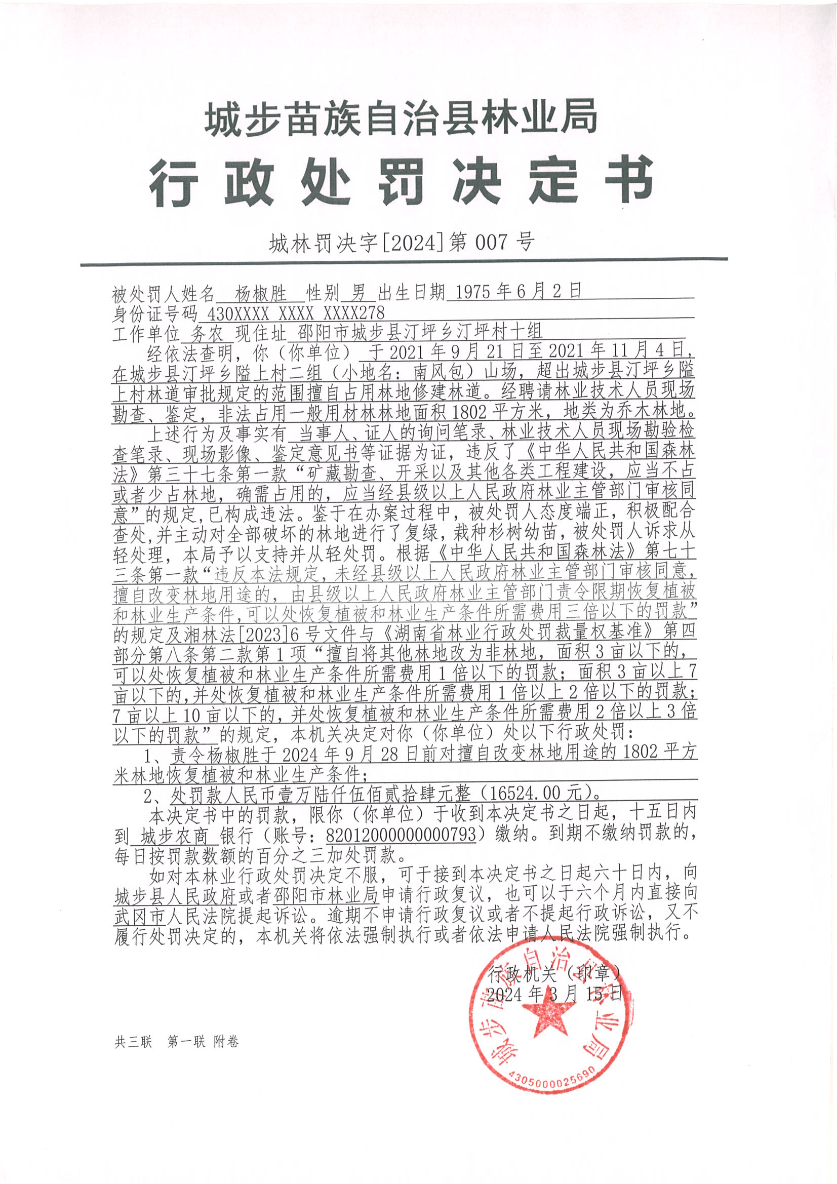城林罚决字﹝2024﹞第007号