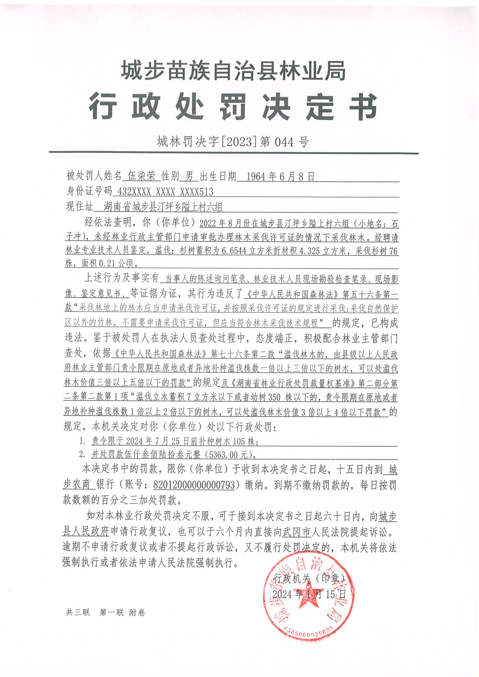城林罚决字﹝2023﹞第044号