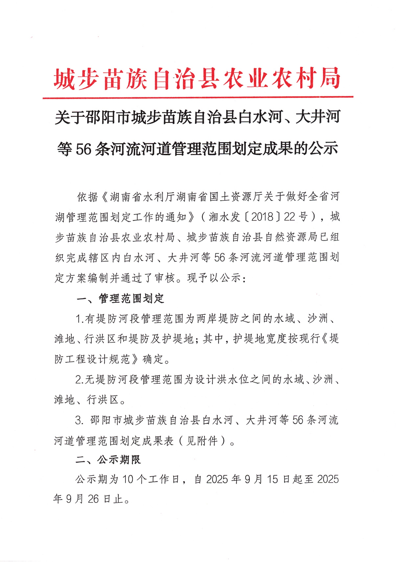 关于邵阳市城步苗族自治县白水河、大井河等56条河流河道管理范围划定成果的公示