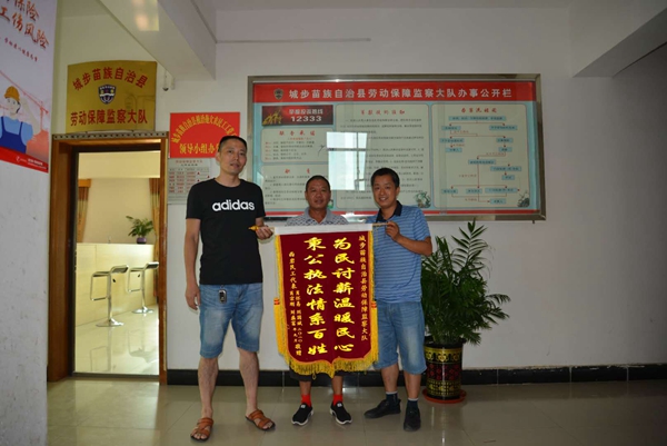 “感谢你们的辛勤工作,帮我们讨回了工钱,感谢劳动监察大队的执法,公司才这么快付了工钱。”9月2日下午,肖某易等人来到城步苗族自治县劳动保障监察大队,将一面红灿灿的锦旗交到工作人员手中。
