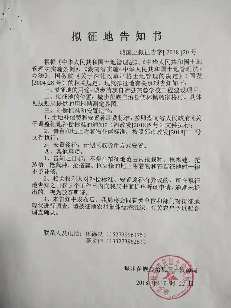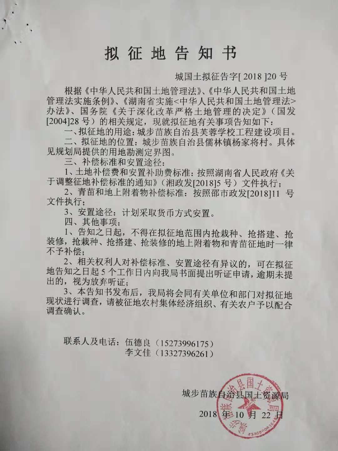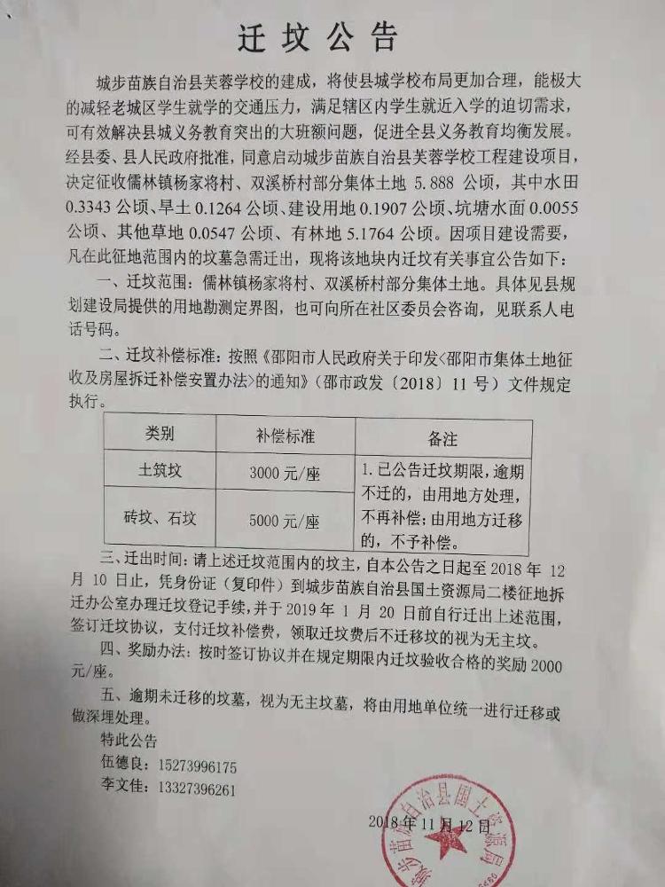 城步苗族自治县芙蓉学校拟征地告知书、迁坟公告