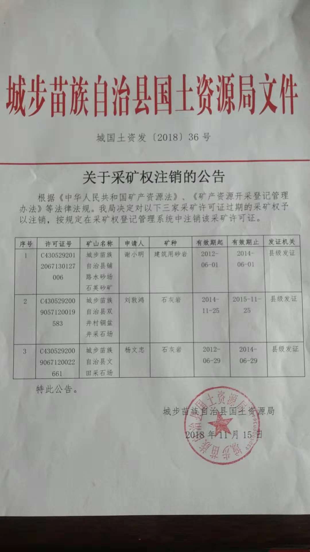 城步苗族自治县国土资源局文件 城国土资发[2018]36号 关于采矿权注销的公告