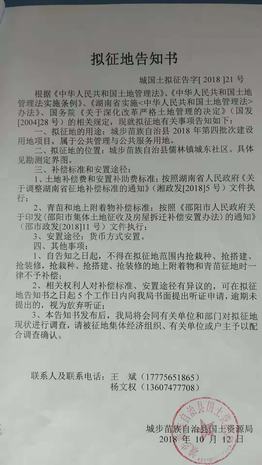 城步苗族自治县2018年第四批次建设用地项目拟征地告知书