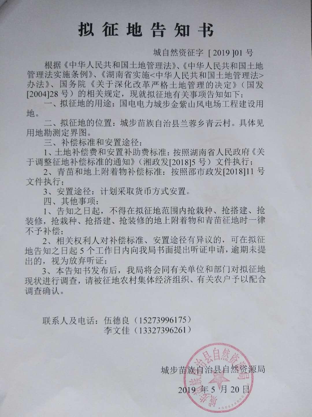 城步苗族自治县国电电力城步金紫山风电场工程建设用地兰容乡青云村拟征地告知书