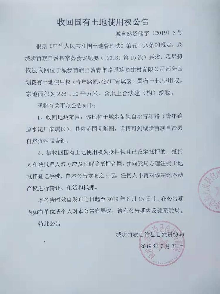 收回国有土地使用权公告(原水泥厂家属区)