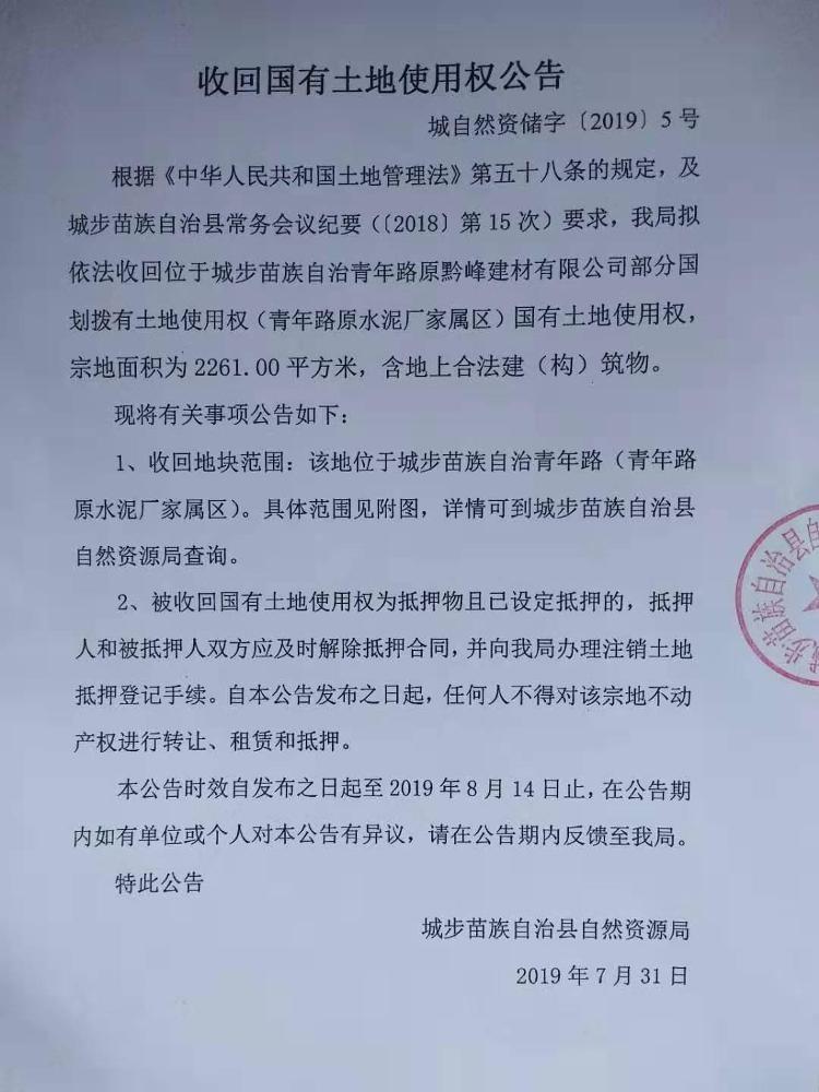 收回国有土地使用权公告(原水泥厂家属区)