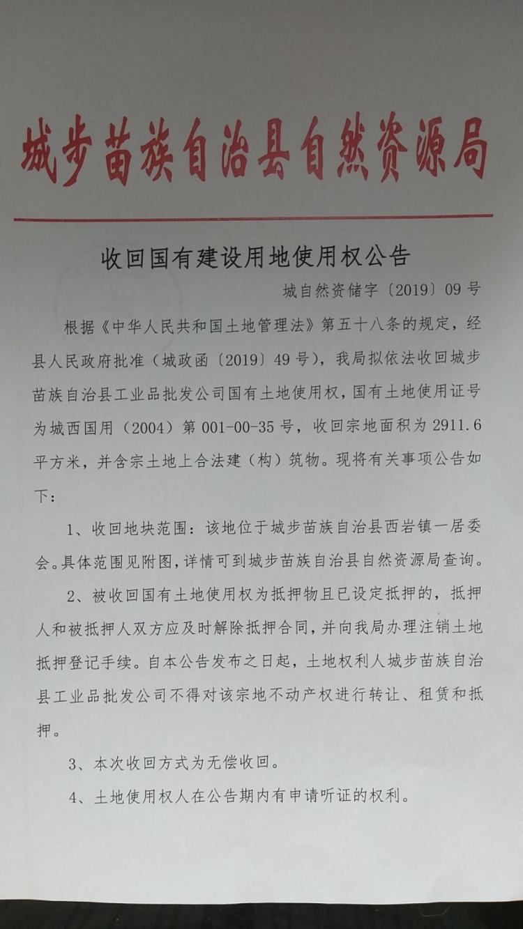 收回国有建设用地使用权公告(工业品公司西岩镇一居委会)